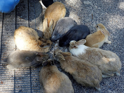 Im übrigen wurden nach Auflösung der Giftgasproduktion und dem Rückzug des Militärs die Kaninchen auf der Insel freigelassen. Da auf Okunoshima keine Fressfeinde der Kaninchen existieren haben sich diese hier fröhlich vermehrt. Wir haben bemerkt, dass die Kaninchen häufig ziemlich ramponierte Ohren haben, ansonsten sehen sie aber relativ fit aus. Ich denke aber, dass man kranken Tieren hier eher der Natur überlässt, kann dies aber weder wiederlegen noch bestätigen.